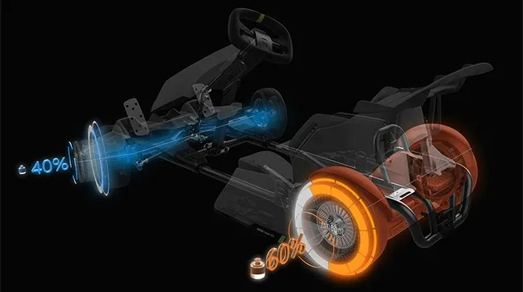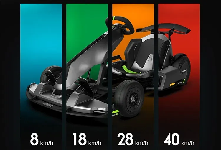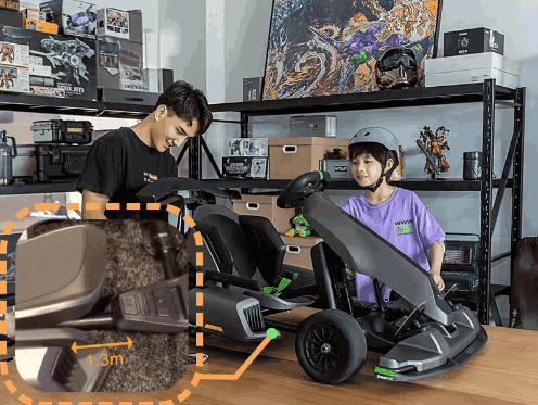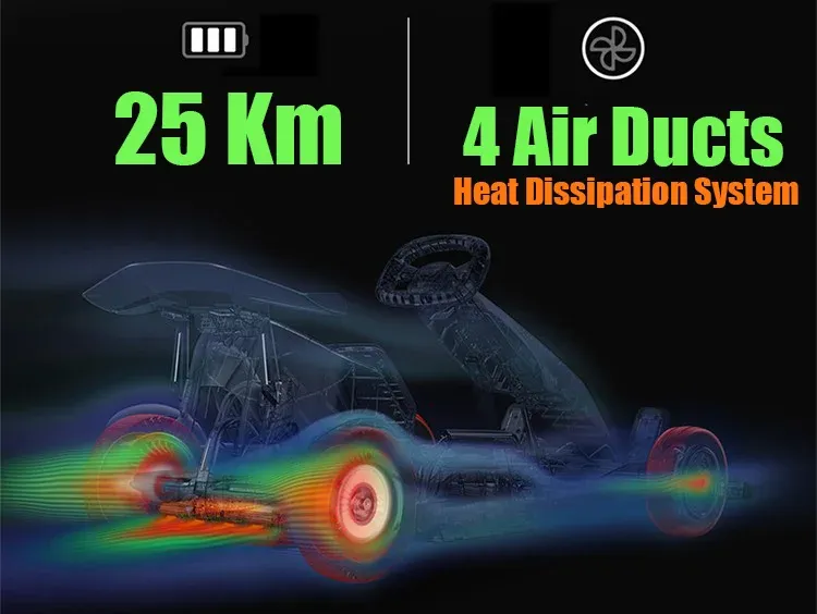 With 2 air-cooled motors with peak power of up to 2400W, with a top speed of 24.8mph(40Km/h) and a maximum acceleration of 1.02g(Enjoy a strong "pushback" feeling), it is perfect for those who want to release stress and have fun. With 4 speed modes: SAFETY mode(5 mph), NOVICE mode(11 mph), SPORT mode(17 mph), TRACK mode(24.8 mph). Satisfy everyone's entertainment!